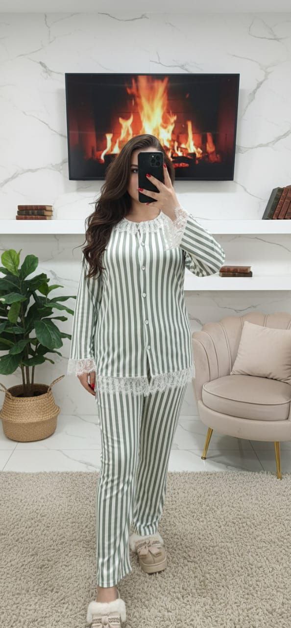 بيجامة نسائية راقية تجمع بين نعومة اللمس وأناقة الخطوط العمودية، مزينة بدانتيل فاخر يمنحك إطلالة أنثوية ساحرة. تصميم مريح وفخم يناسب المرأة التي تبحث عن رفاهية في كل تفصيلة.